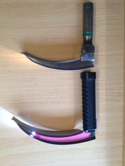 What laryngoscope blade do you commonly use in your intubations? I have been having an email discussion with a couple of anaesthetists about this over the past week. The feature image shows two of my personal laryngoscopes I currently use. My favourite is the disposable Trulite MAC 4 bladed LED laryngoscope pictured. Note the LED light is much brighter than the second laryngoscope, despite being AA alkaline battery powered. The smaller MAC 3 bladed laryngoscope has a German low profile steel reuseable blade with an acrylic light bundle. The handle is a micro length design using CR 25 lithium batteries common to cameras and a standard bulb. The lithium battery produces a higher intensity light but that still does not equal the LED from the Trulite.